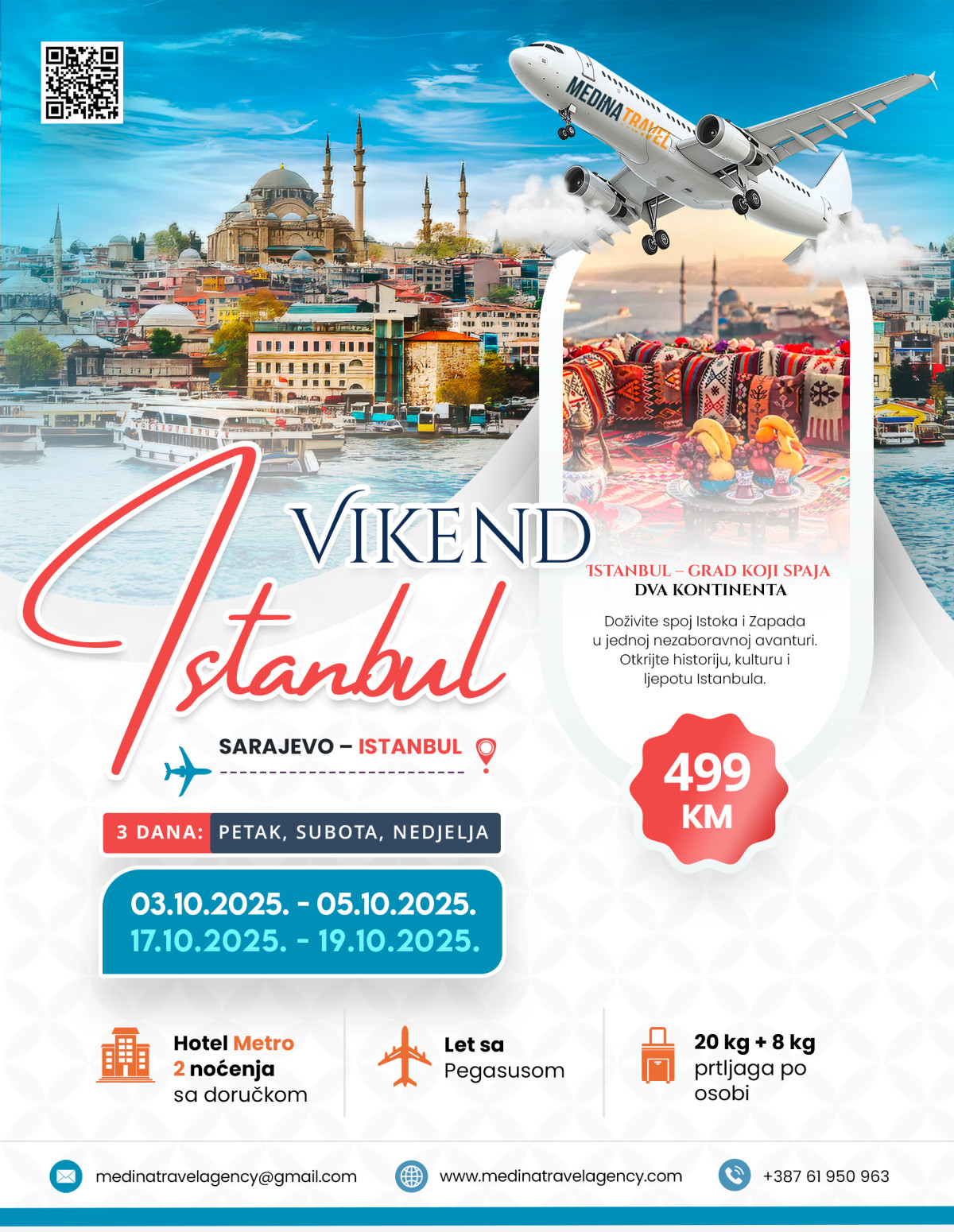 Medina Travel Agency zadržava pravo izmjene cijena uslijed promjene troškova prijevoza, kursa valute ili nedovoljnog broja putnika, kao i otkazivanja putovanja najkasnije 5 dana prije polaska.