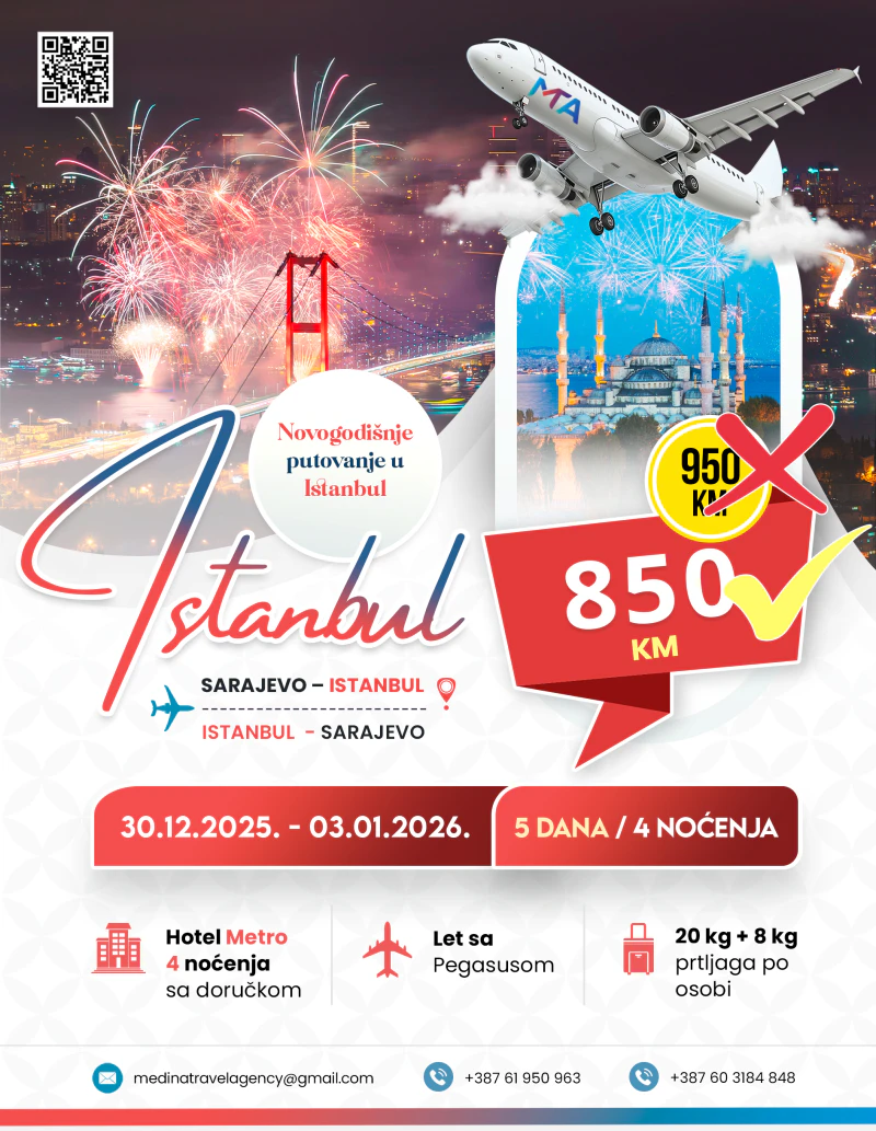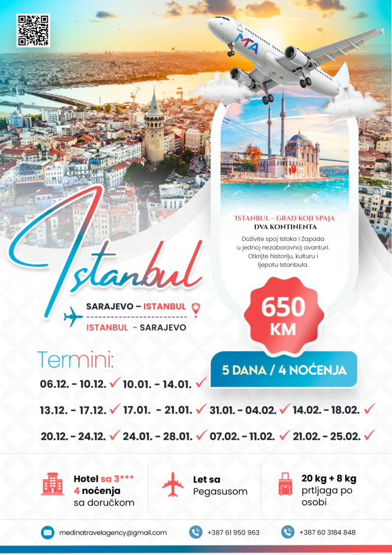 Doživite čaroliju Istanbula u samo nekoliko dana! Vikend aranžman je savršena prilika da se upoznate sa spojem tradicije i modernog života u ovom jedinstvenom gradu. Uživajte u historiji, kulturi i gastronomiji Istanbula – grada koji uvijek ostavlja poseban utisak. Aranžmani Istanbul 2025.