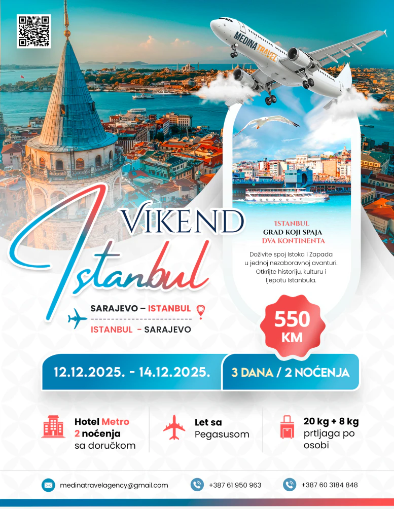 Doživite čaroliju Istanbula u samo nekoliko dana! Vikend aranžman je savršena prilika da se upoznate sa spojem tradicije i modernog života u ovom jedinstvenom gradu. Uživajte u historiji, kulturi i gastronomiji Istanbula – grada koji uvijek ostavlja poseban utisak. Aranžmani Istanbul 2025.