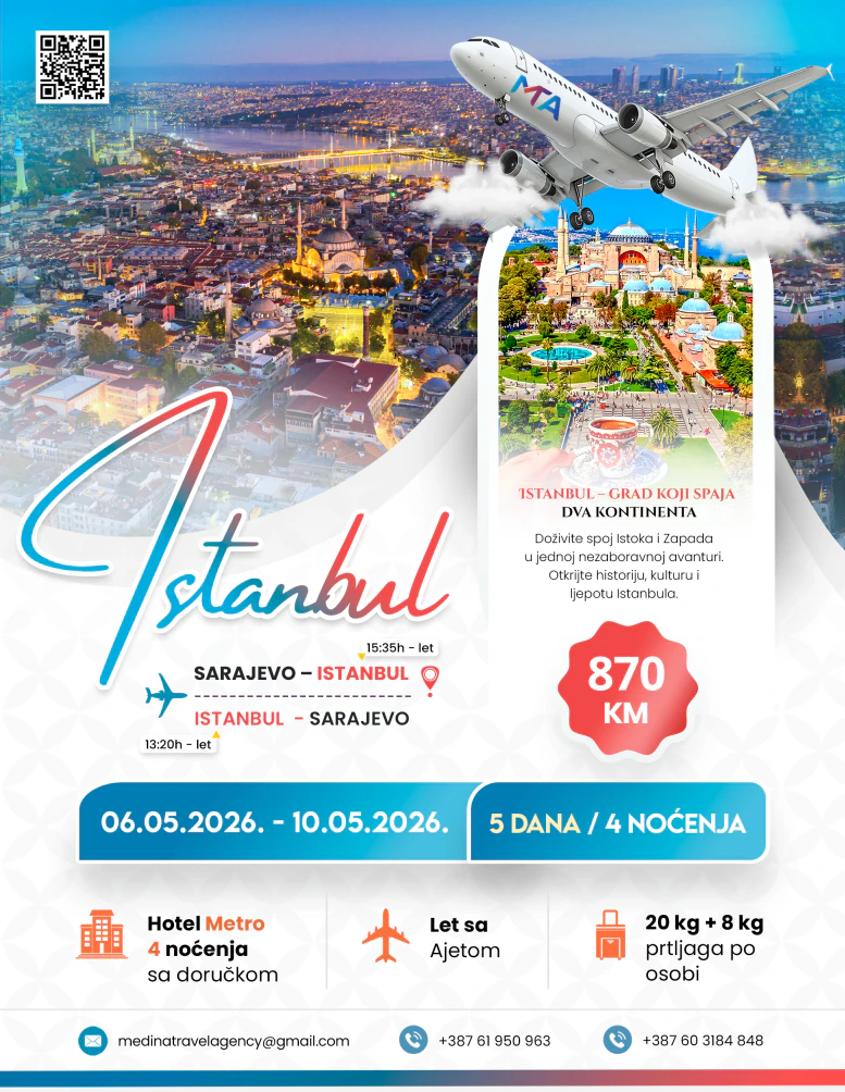 Tražiš Istanbul putovanje Sarajevo i želiš jasnu ponudu bez nepoznanica? Ovdje su informacije o aktuelnim terminima, šta je uključeno u aranžman, kakav je smještaj i kako najbrže rezervisati putovanje iz Sarajeva u Istanbul.