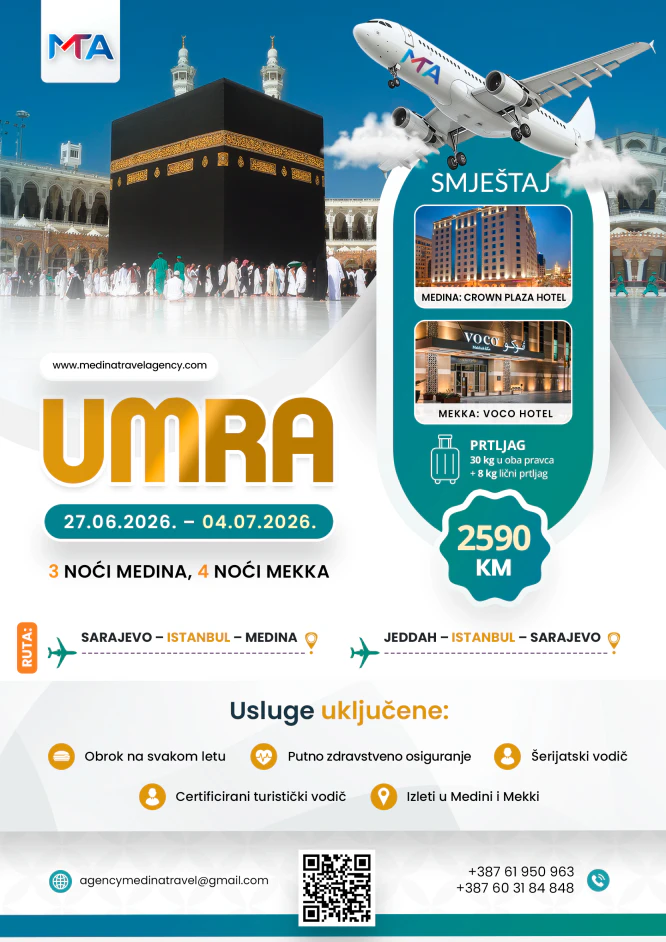 Medina Travel nudi posebno pripremljen Umra paket. Putovanje uključuje 3 noći u Medini i 4 noći u Mekki, sa smještajem u hotelima: