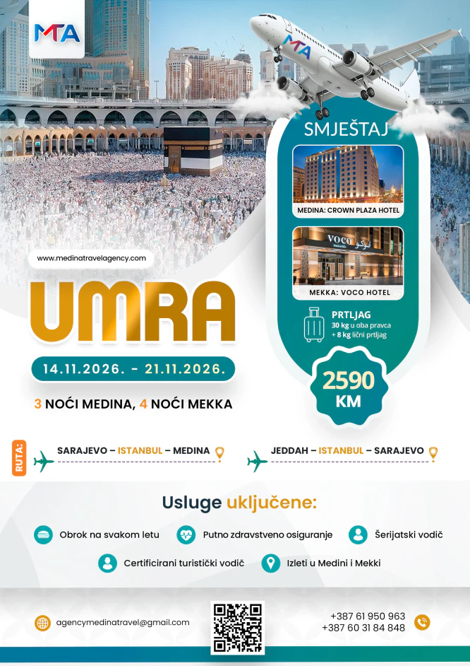 Medina Travel nudi posebno pripremljen Umra paket. Putovanje uključuje 3 noći u Medini i 4 noći u Mekki, sa smještajem u hotelima: