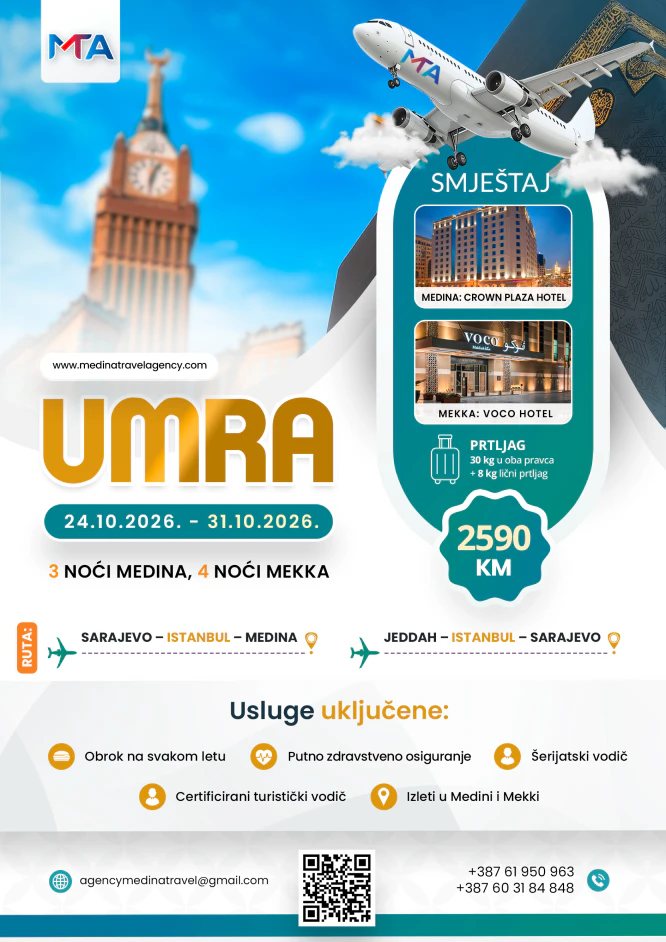 Medina Travel nudi posebno pripremljen Umra paket. Putovanje uključuje 3 noći u Medini i 4 noći u Mekki, sa smještajem u hotelima: